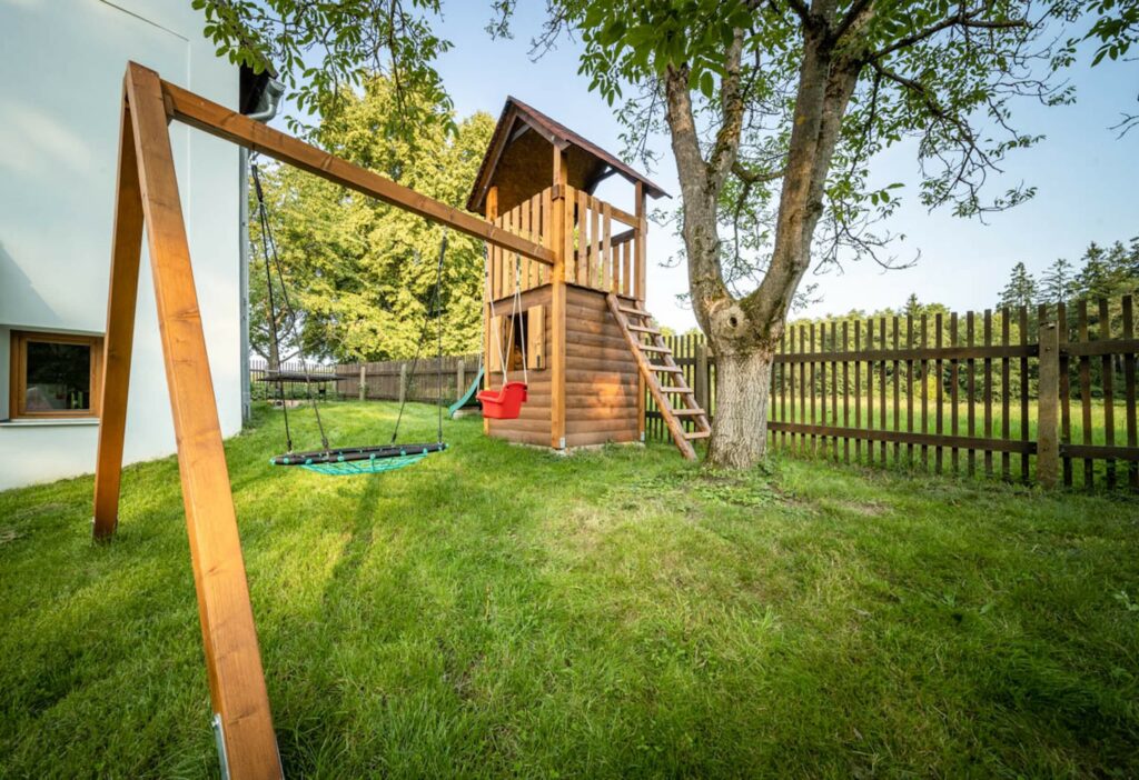Dětské hřiště, společné grilování na ohni a posezení na terase při západu slunce.